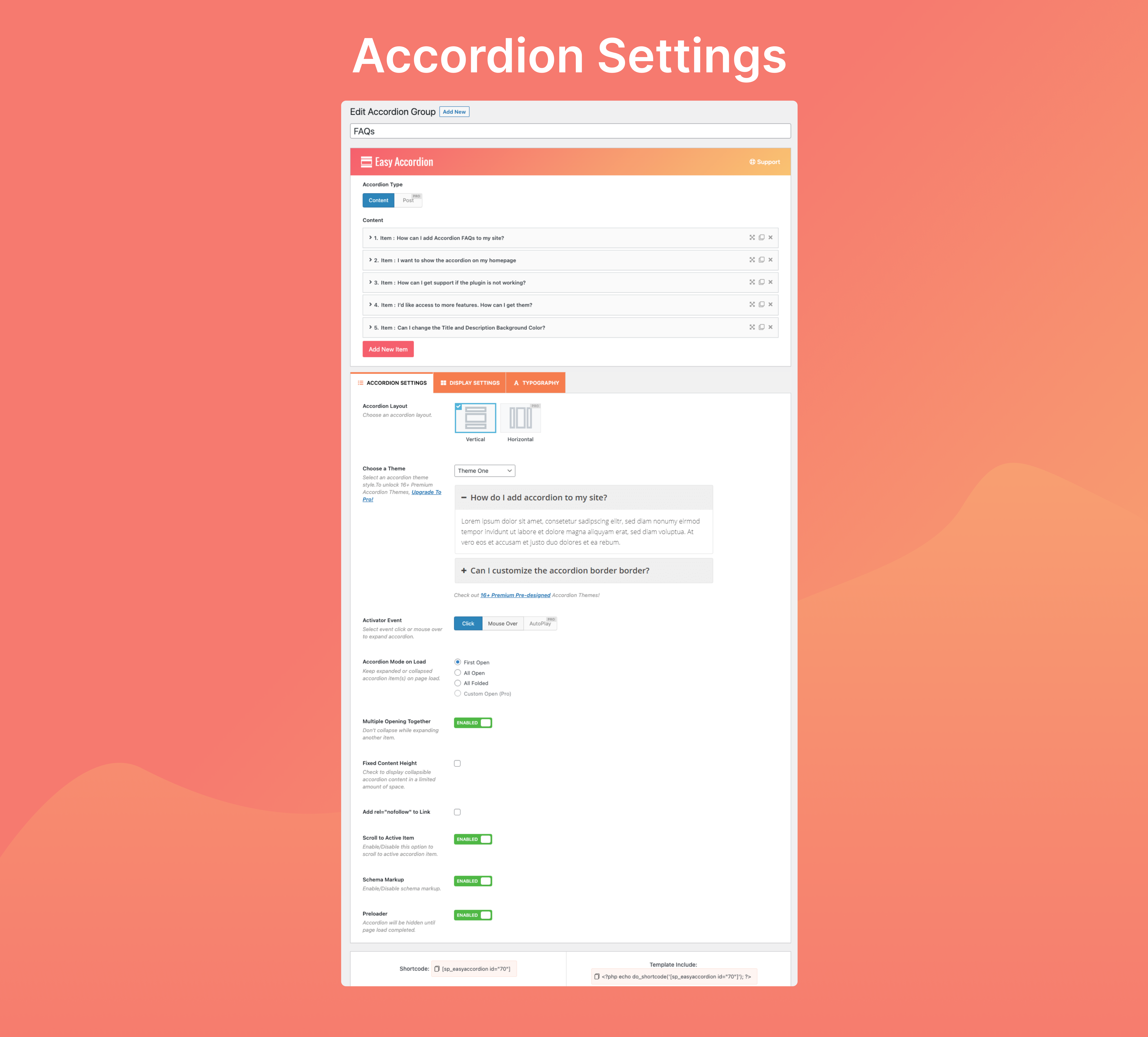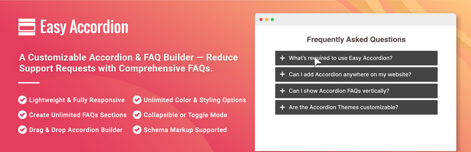 Easy Accordion is a responsive Accordion and FAQ builder plugin for WordPress. It allows you to create unlimited accordions, FAQ sections, or pages, as well as WooCommerce Product FAQs, using a simple drag & drop interface. The plugin is lightweight, easy to use, and comes with lot of customization options to match your site’s design.