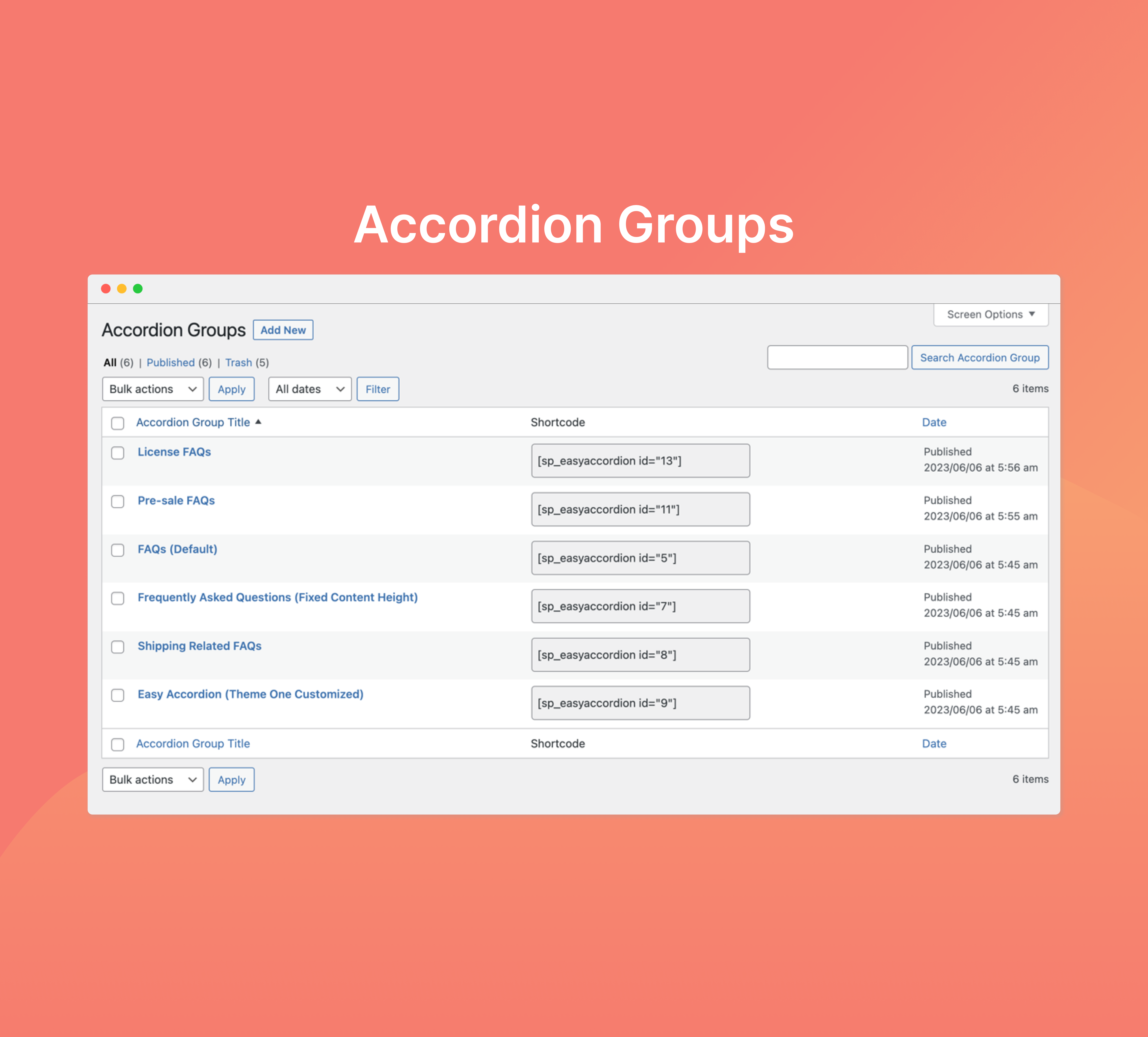 You can add accordions anywhere on your site using the Gutenberg block editor or shortcodes in the classic editor. This makes it simple to organize and display content such as FAQs, product details, service information, or any collapsible content.