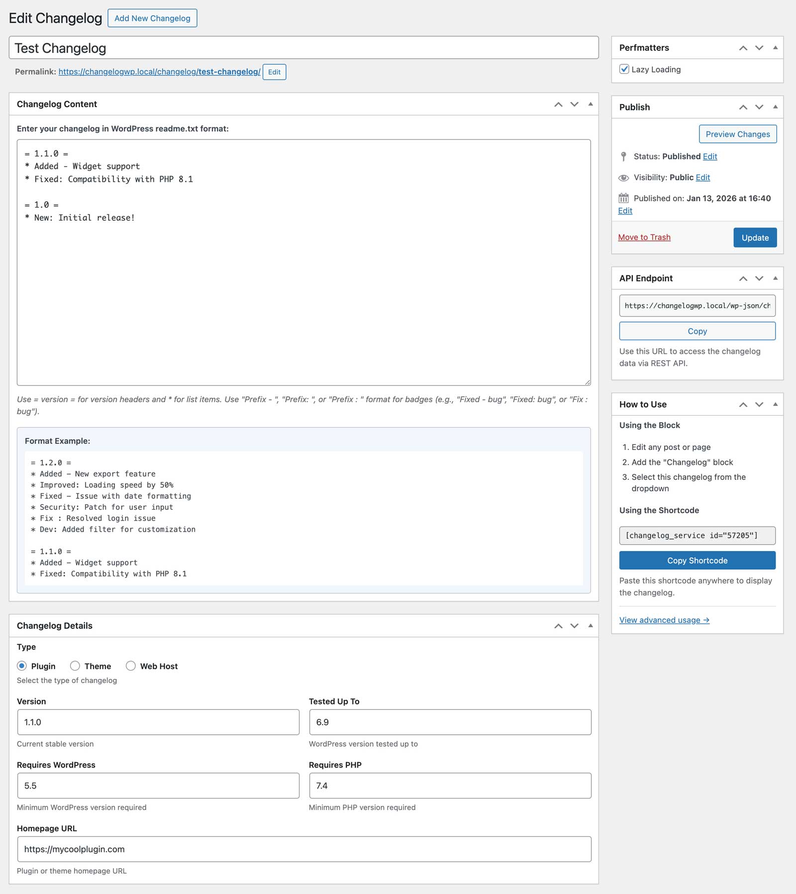 3. Automatic Display: If your changelog post type is public, it displays automatically on single changelog pages -