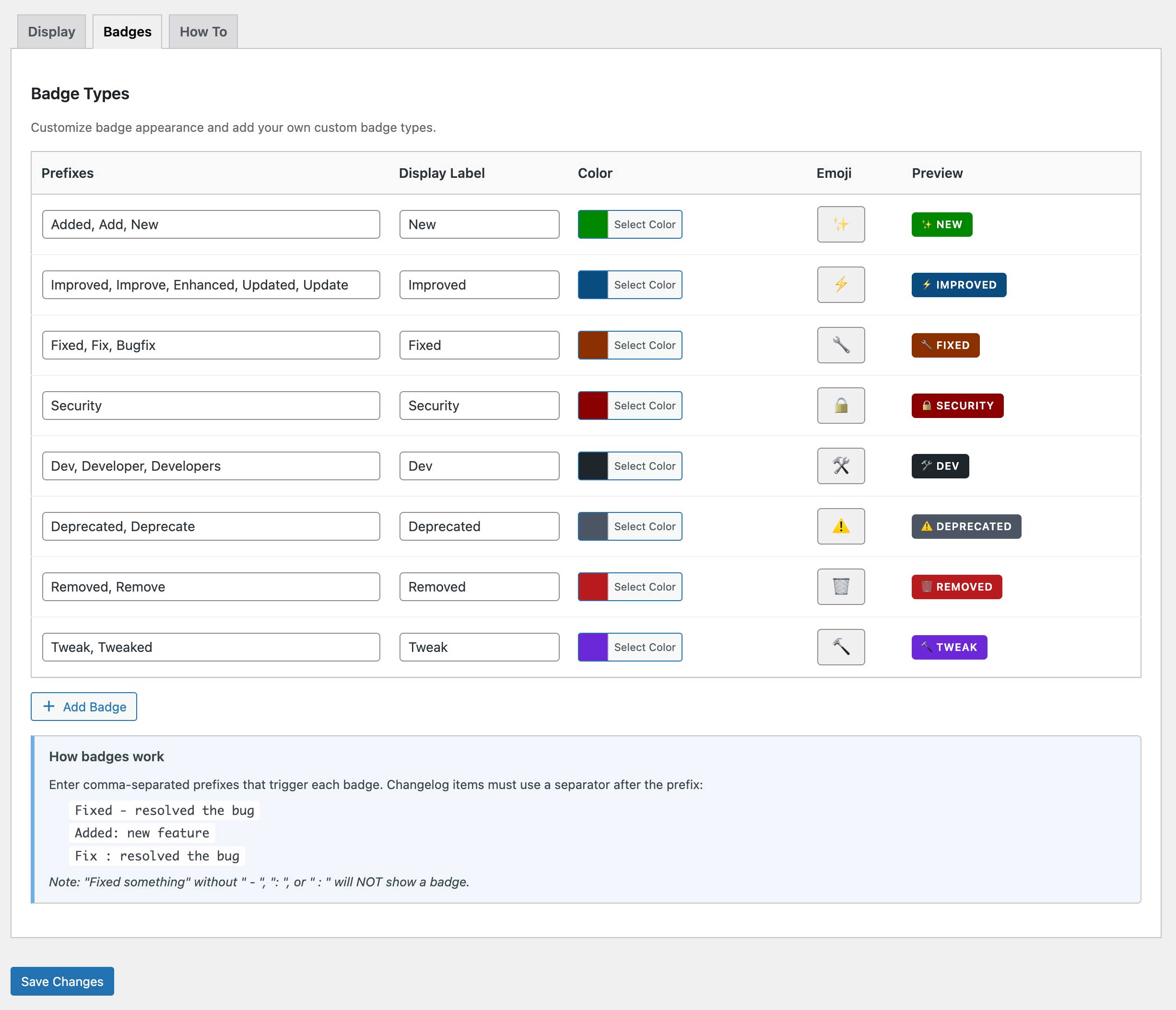 - Color-Coded Badge System – Automatic badges for Added, Fixed, Improved, Security, Dev, Deprecated, Removed, and Tweak