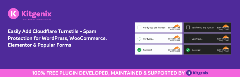 Kitgenix CAPTCHA for Cloudflare Turnstile is a production-ready Turnstile integration for WordPress that focuses on three things: