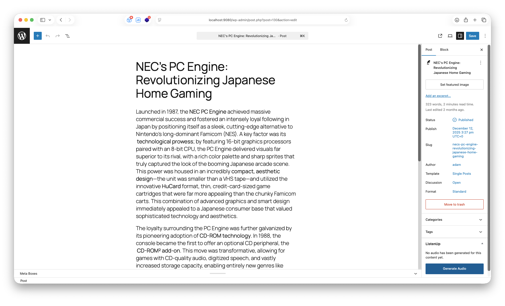 2. Generate: Use the meta box on any post/page to generate audio